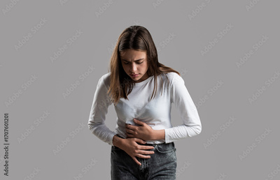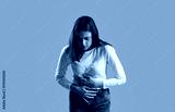 Woman holding stomach with both hands, the concept abdominal pain. Ache concept. Stomach pain and others stomach disease concept. Girl with stomach ache on gray background