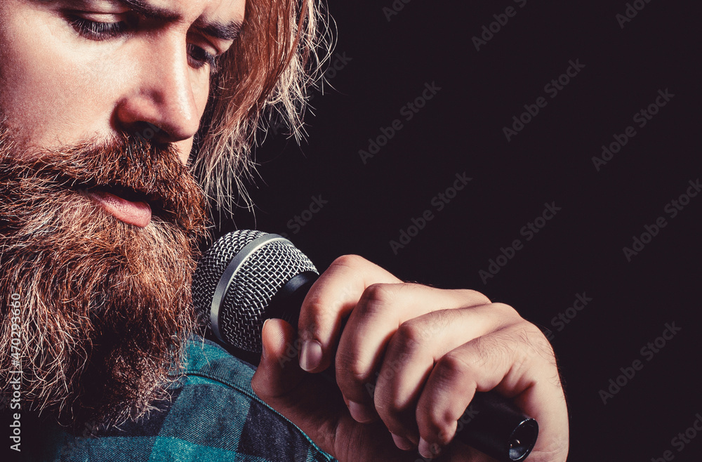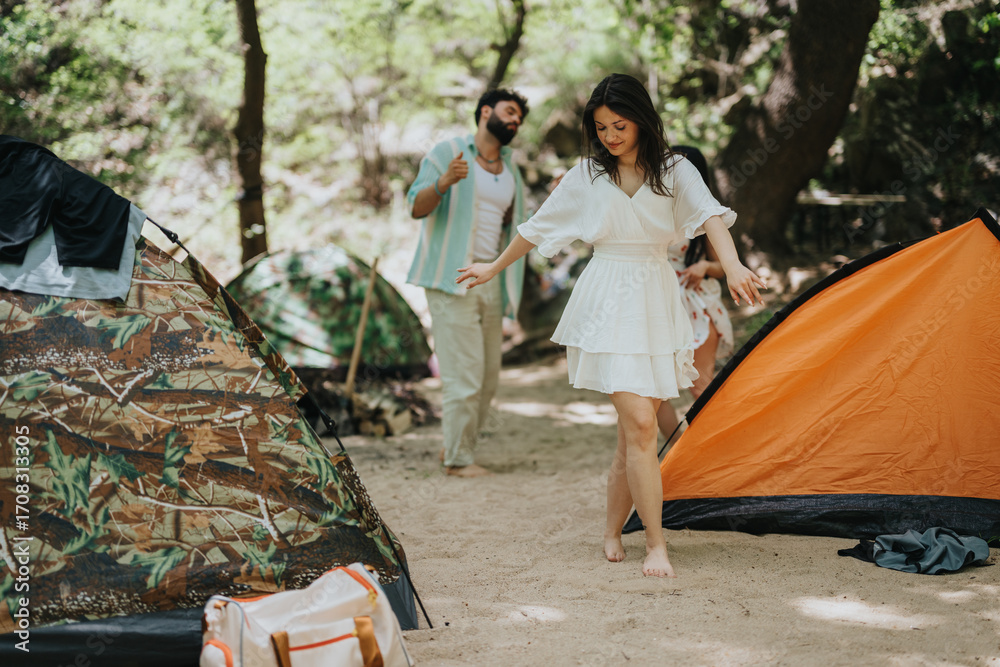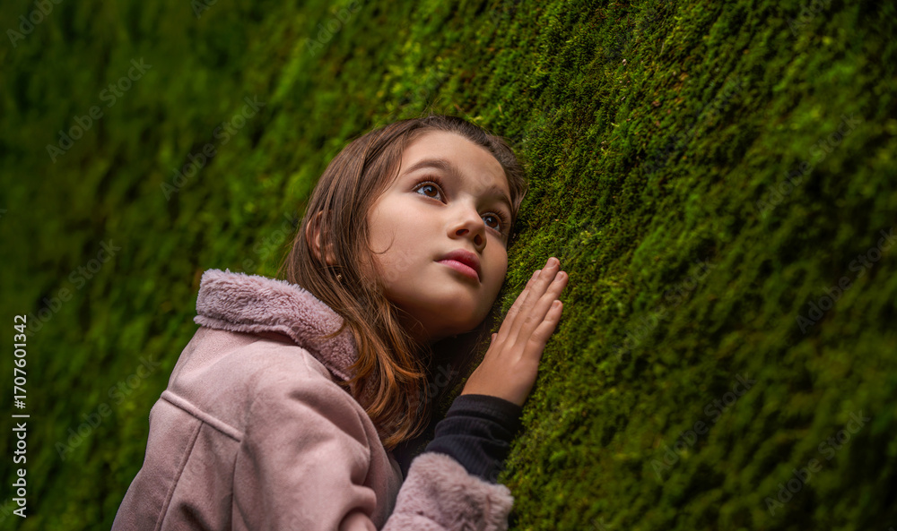 Cute little girl standing in deep dark forest at old tree covered with green moss. Girl is touching fluffy moss in summer forest. Child girl lies on the soft and delicate moss covering forest