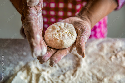 Baking at home. Cooks dough for baking, pieces of raw dough. Womans hands rolling doughs for pies. Homemade cakes dough in the women's hands. Process of making pies, hand