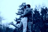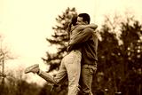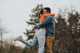 A young couple shares a joyful embrace amidst a serene outdoor setting with trees.