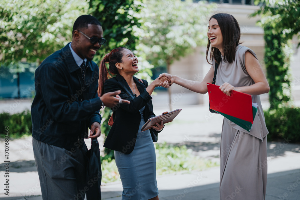 Three business colleagues joyfully interacting and sharing lighthearted moments outdoors, emphasizing team cohesion.