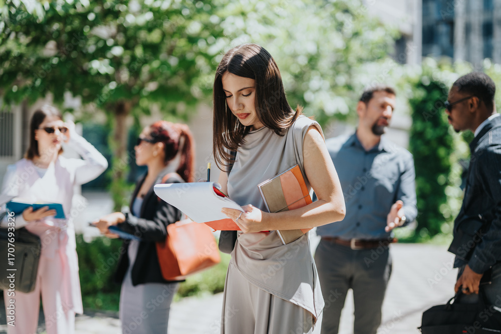 A team of diverse colleagues engaging in discussions, reviewing documents, and interacting outdoors in a work-related collaboration.