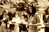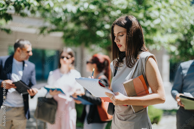 A focused group of colleagues working collaboratively in an outdoor urban setting.