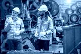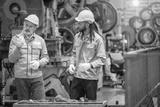 Two engineers discussing machinery safety protocols industrial workshop informative meeting indoor environment close-up viewpoint