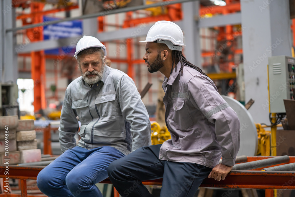 Collaboration between workers in manufacturing facility workshop candid photo industrial environment close-up teamwork concept