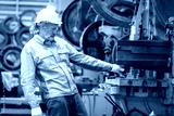 Industrial worker operating machinery manufacturing facility action shot workshop environment focused viewpoint safety practices