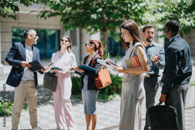 A group of diverse colleagues, engaged in discussion and note-taking, stand outdoors under sunny weather.