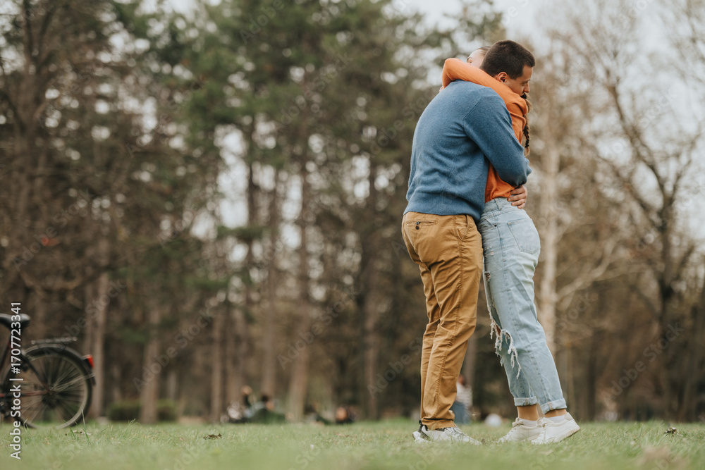A young couple shares a heartfelt embrace in a picturesque outdoor park, surrounded by nature.