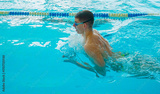Swimmers training in the pool. Breaststroke style. Sports, determination and endurance. Swimming competitions.