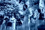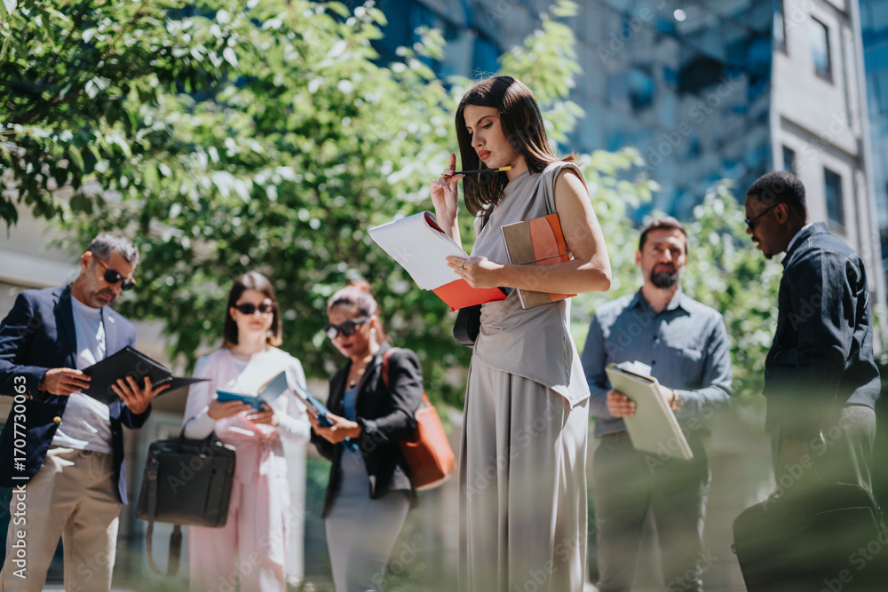 Multiracial colleagues collaborate during an outdoor business meeting, reviewing documents and sharing insights.