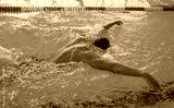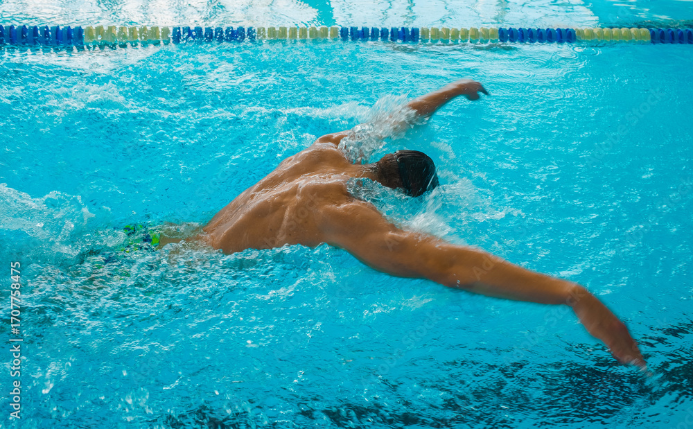 Professional Swimmer Performing Butterfly Stroke – Speed, Power and Determination. Swimming Competition – Athlete in Butterfly Style Training in Blue Water Pool