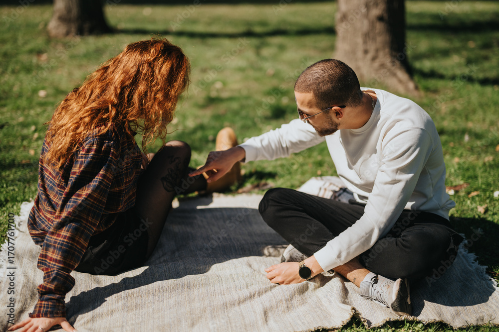 A young couple sits on a blanket in the park, enjoying a relaxing sunny day outdoors and sharing a moment together amidst the natural surroundings.