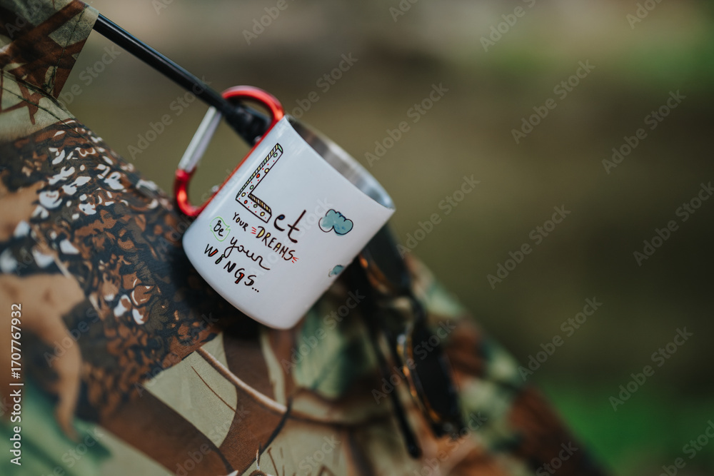 Metal cup displaying motivational text attached to camping equipment, emphasizing adventure and positive thoughts.