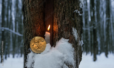 burning candle and moon amulet on tree trunk, nature background of winter forest. mystery atmosphere. Christmas, New Year, Yule Holidays. witchcraft, magic, esoteric spiritual ritual. winter solstice
