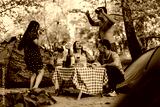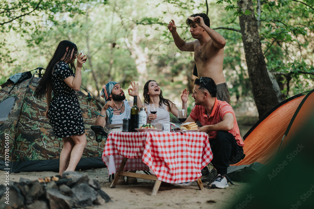 A joyful gathering of friends surrounding a table outdoors, sharing meals and conversations near camping tents in a lush forest area, representing recreation, companionship, and outdoor activities.