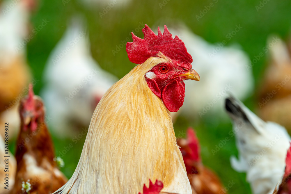 In einer Bio-Geflügelzucht laufen Hühner und Hahn in artgerechter Haltung freilaufend auf der grünen Wiese