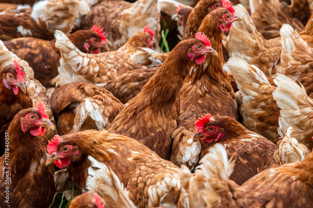 In einer Bio-Geflügelzucht laufen Hühner und Hahn in artgerechter Haltung freilaufend auf der grünen Wiese
