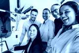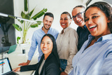 Multigenerational business people doing selfie inside company office - Multiracial colleagues having fun together - Job relationship and corporate concept - Main focus on right girl face