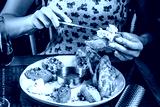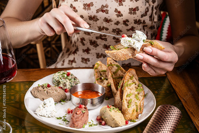 Bread with Georgian spreads and human hands.