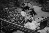 Man relaxes in a hammock using a laptop in a forested campsite with tents and friends in the background, portraying a harmonious blend of nature and technology during leisure and socializing moments.