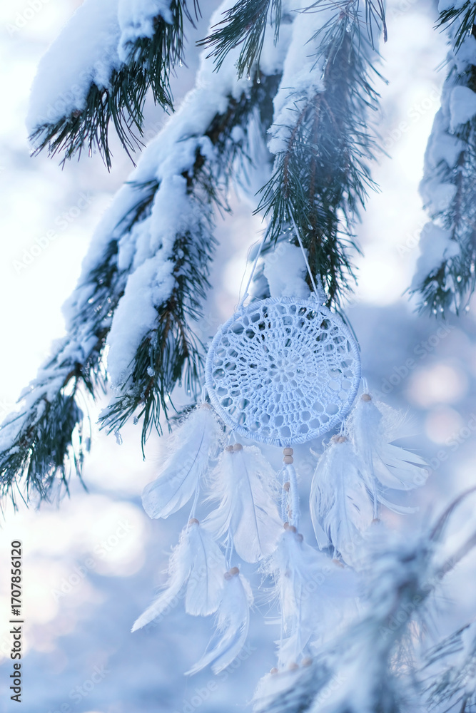 beautiful white dream catcher hanging on snowy pine tree, winter forest nature background. ethnic Shaman native amulet, protection of dreams. spiritual symbol, Magic talisman for soul relax