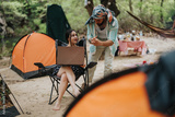 Friends enjoying a camping trip with tents, technology, and a serene outdoor location.