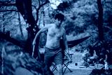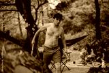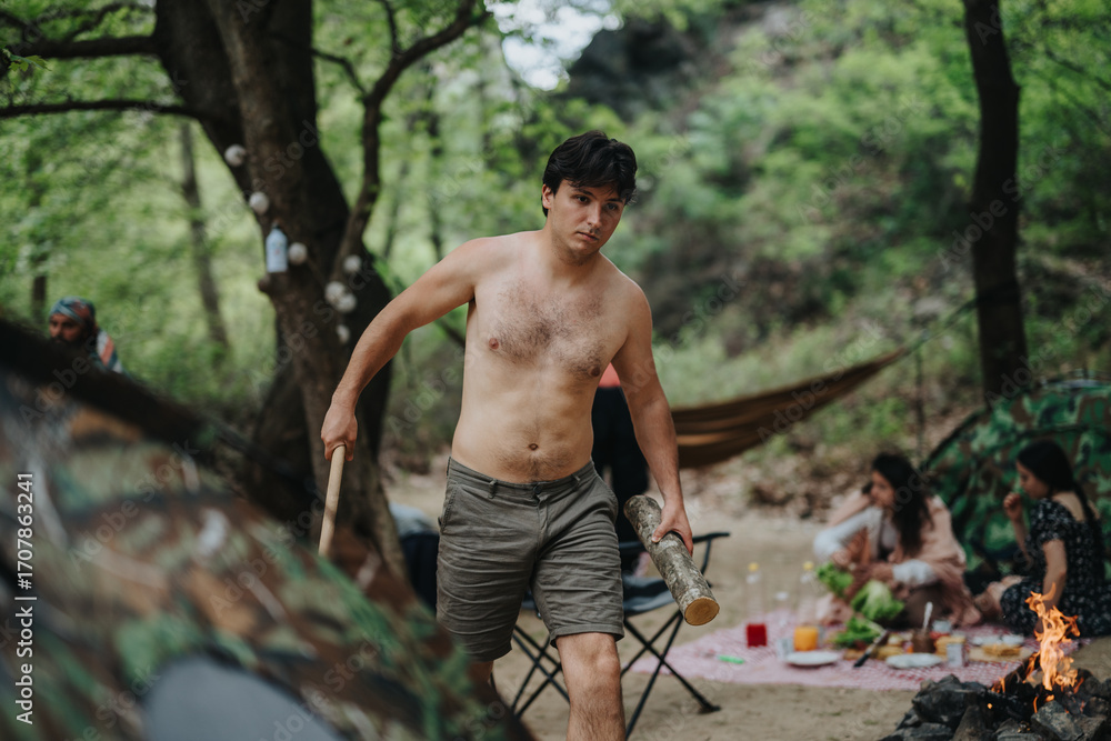 A man is seen carrying firewood near a campsite in a lush green forest, preparing for the campfire, with friends engaging in leisure activities in the background.