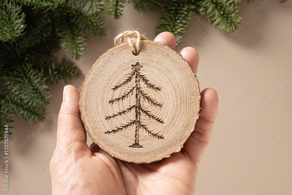 Christmas toy made of decorative wooden slice with ornament as Xmas tree on beige background. Handmade hobby. DIY. Nature material. Xmas decoration. Eco friendly. Zero waste. Sustainable gifts. View