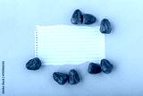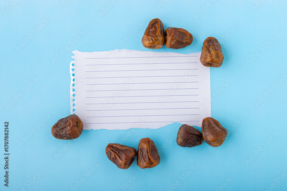 Flat lay sweet fresh sukkari dates with white ripped torn sheet of notebook paper on vibrant blue surface background