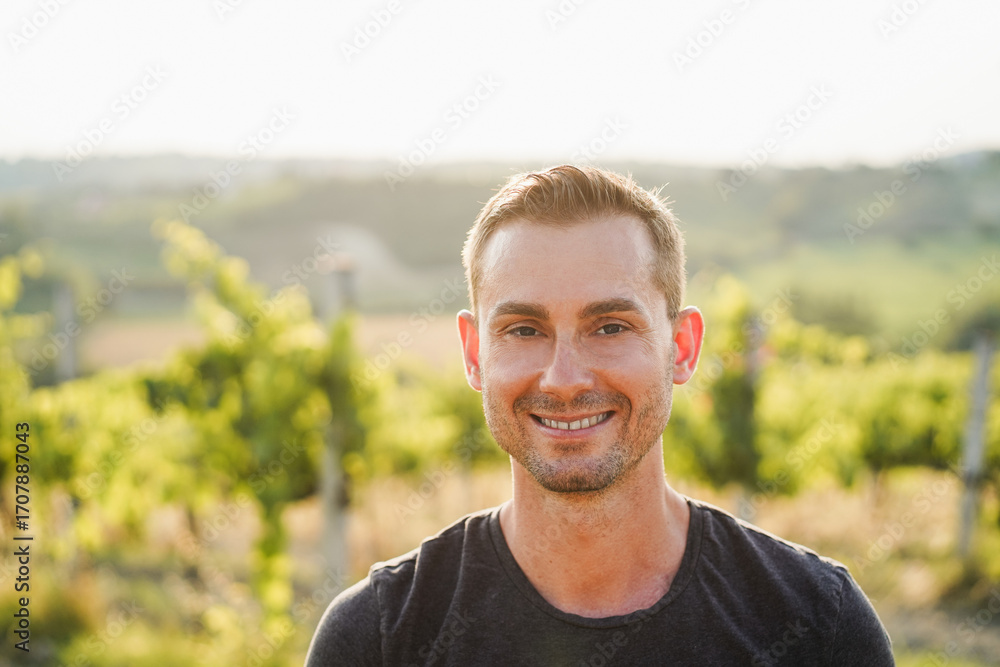 Young man wine producer man smiling in camera with vineyard in background - Organic farm and small business concept - Focus on his face