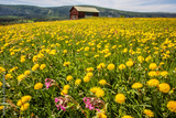 Summer meadow with yellow flowers and a old barn in the background