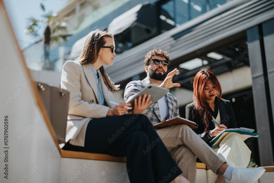 Outdoor scene of diverse business people collaborating and engaging in a conversation. A man gestures while speaking, and two women attentively take notes, showcasing teamwork and communication.