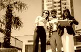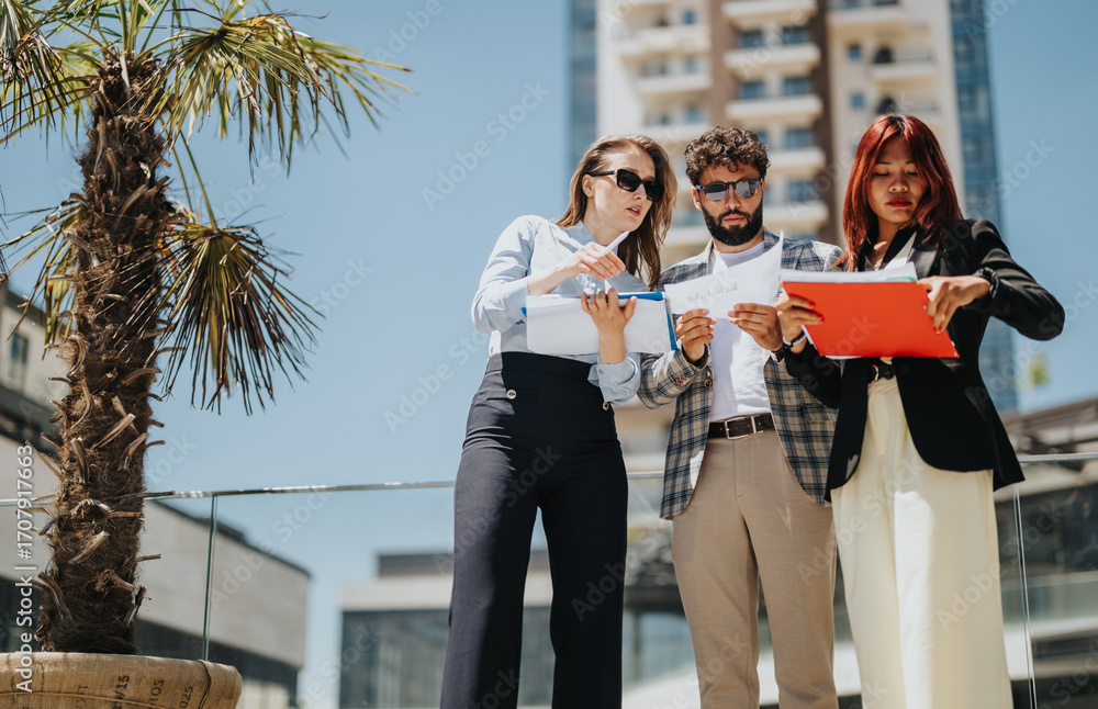 A diverse group of people, dressed in professional attire, discussing documents outdoors in a sunny urban environment, emphasizing collaboration, teamwork, and professional exchange.