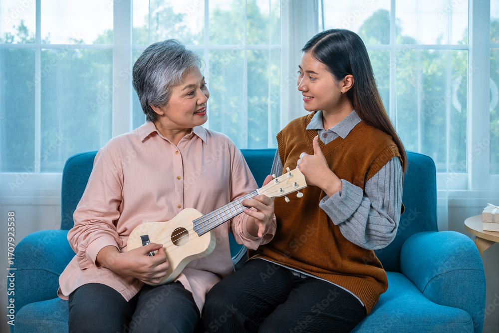 Senior Asian elderly woman playing ukulele with granddaughter giving support