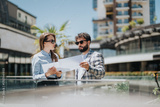 Two individuals in professional attire reviewing plans in a contemporary outdoor environment