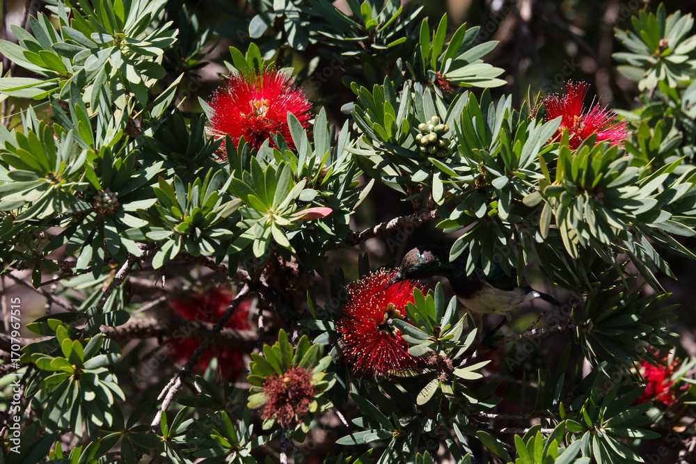 White-bellied Sunbird Feeding on Red Flower (Cinnyris talatala)