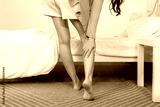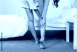 Women suffering from leg cramp or calf pain after waking up in the morning, standing beside bed with painful expression. Health problem, muscle strain, cramp or injury concept.