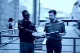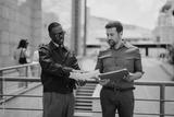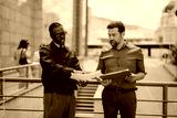 Two individuals engaged in a focused discussion while reviewing paperwork, representing teamwork, productivity, and modern business communication, captured outside an urban office setting.