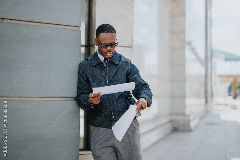 A young businessperson stands by a wall, reviewing documents with focus. The setting appears to be urban, emphasizing professionalism and work-focused activities.