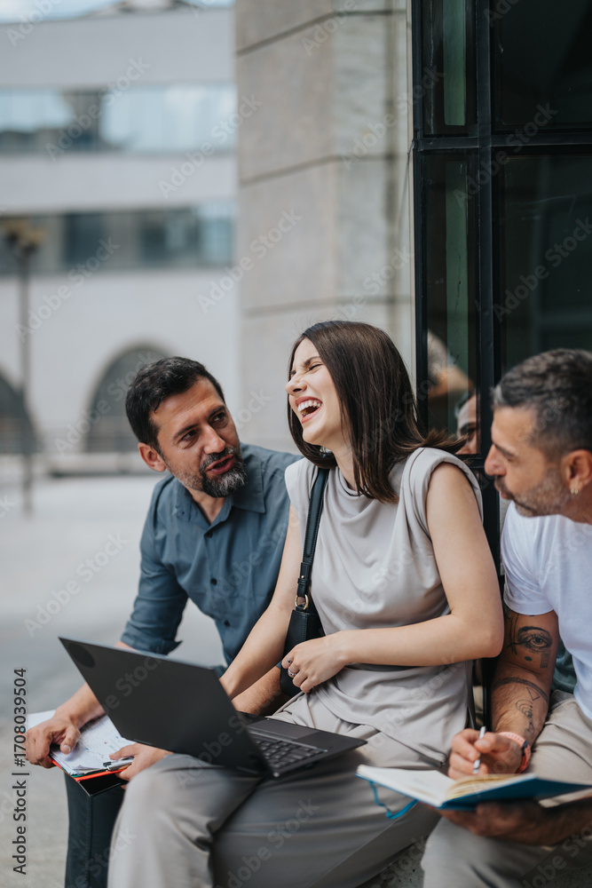 A group of professionals laughing and engaging in a team discussion outdoors with a laptop.