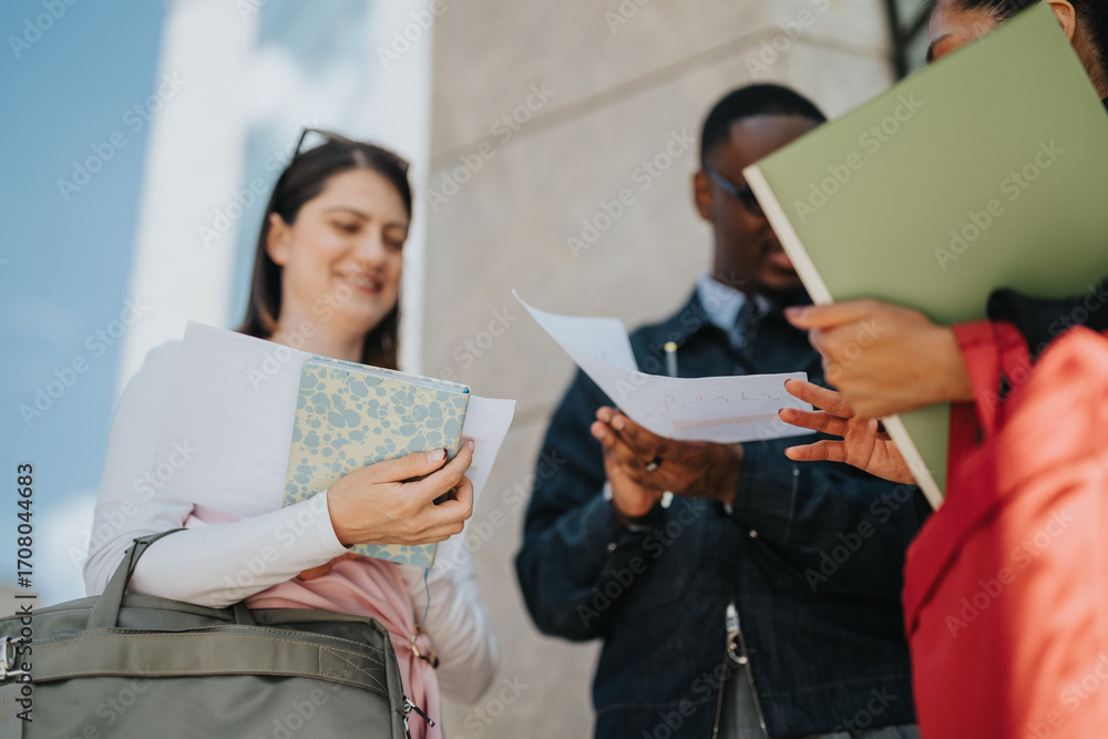 Colleagues standing outside a modern building, sharing and reviewing paperwork. This image conveys teamwork, collaboration, and professional interaction in a corporate or academic environment.