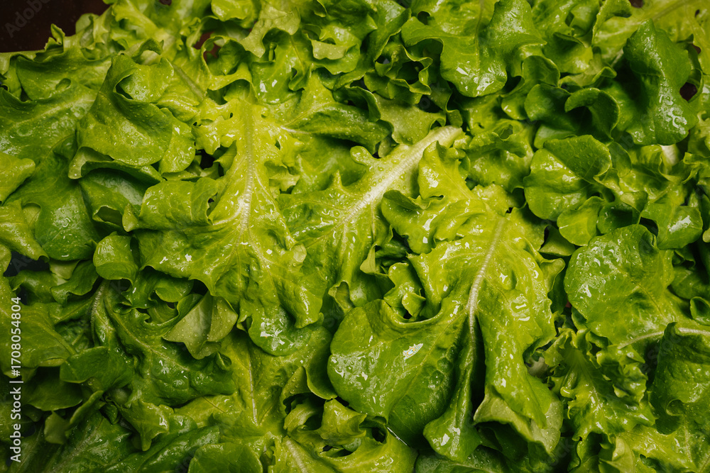 Top view of freshly harvested green lettuce leaves forming textured and vibrant backdrop, perfect for showcasing healthy recipes, close-up, nobody. Concept of promoting benefits of plant-based diet.