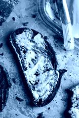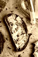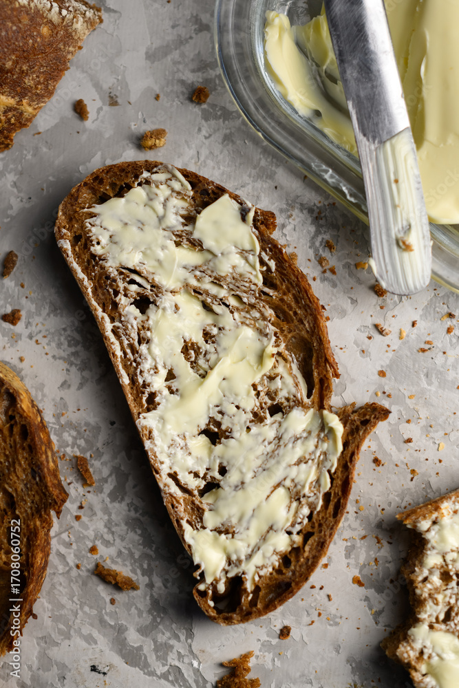 Top view of sliced rye sourdough bread with butter and knife close up. Food background