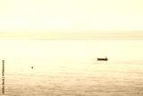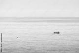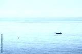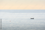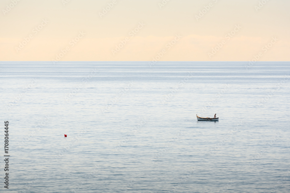Small lonely fishing boat in calm water of Mediterranean sea at sunrise. Minimalist landscape photography