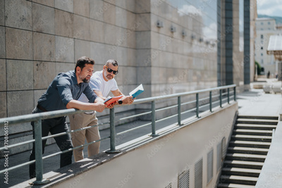 Two professionals standing by a handrail in a modern urban setting discussing documents and ideas.