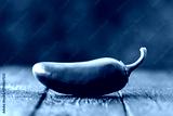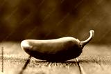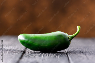 Single green jalapeno hot pepper on rustic wooden table close up. Food photography