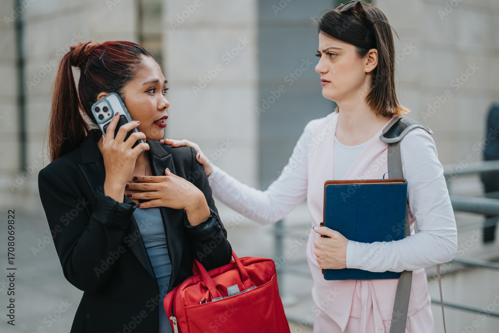 Two professionals engaged in a meaningful interaction, one holding a smart phone and the other carrying a file, symbolizing collaboration and workplace communication.