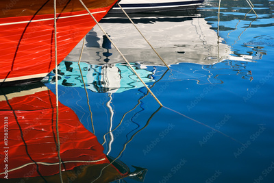 Reflection of moored yachts in the clear blue water of the sea port. Marine life concept