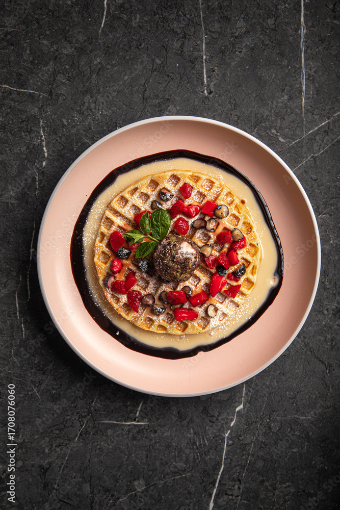 Waffle dessert with chocolate ice cream and fresh berries on pink plate