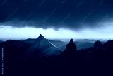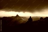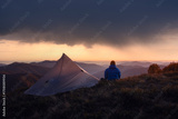 Hiker near tent admires sunset sky above fall-colored mountains in evening light. Highland camping silhouette shown in peaceful dusk wilderness. Landscape photography